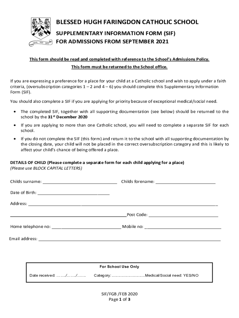 BLESSED HUGH FARING DON CATHOLIC SCHOOL SUPPLEMENTARY INFORMATION FORM (IF) FOR ADMISSIONS FROM SEPTEMBER 2021 This form should be read and completed with reference to the Schools Admissions Policy.