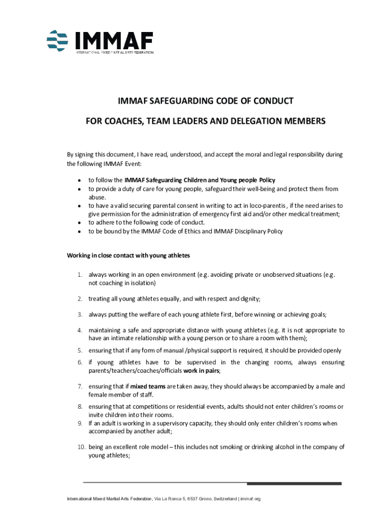 IMAF SAFEGUARDING CODE OF CONDUCT FOR COACHES, TEAM LEADERS AND DELEGATION MEMBERS By signing this document, I have read, understood, and accept the moral and legal responsibility during the following