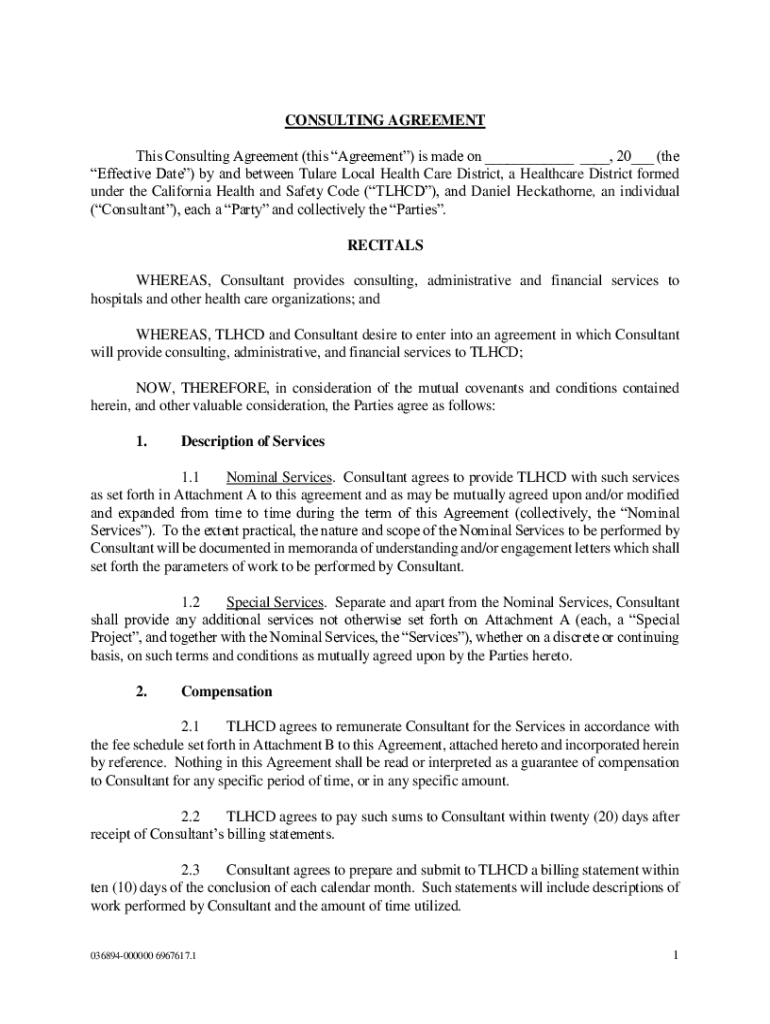 CONSULTING AGREEMENT This Consulting Agreement (this Agreement) is made on, 20 (the Effective Date) by and between Tulane Local Health Care District, a Healthcare District formed under the California