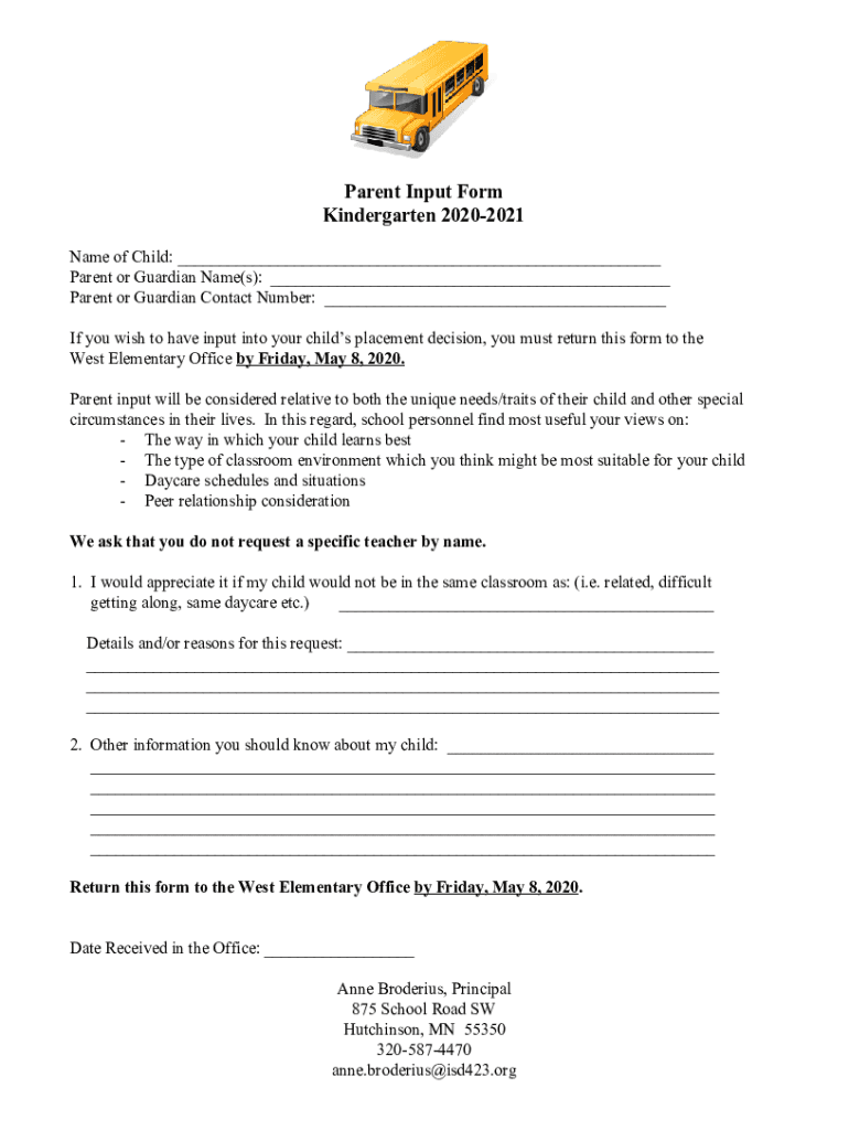 Parent Input Form Kindergarten 20202021 Name of Child: Parent or Guardian Name(s): Parent or Guardian Contact Number: If you wish to have input into your children placement decision, you must return