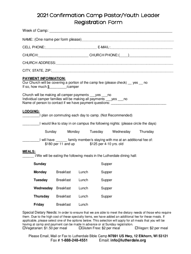 2021 2021 Confirmation Camp Pastor/Youth Leader Registration Form Week of Camp: NAME: (One name per form please) CELL PHONE: EMAIL: CHURCH: CHURCH PHONE:() CHURCH ADDRESS: CITY, STATE, ZIP: PAYMENT