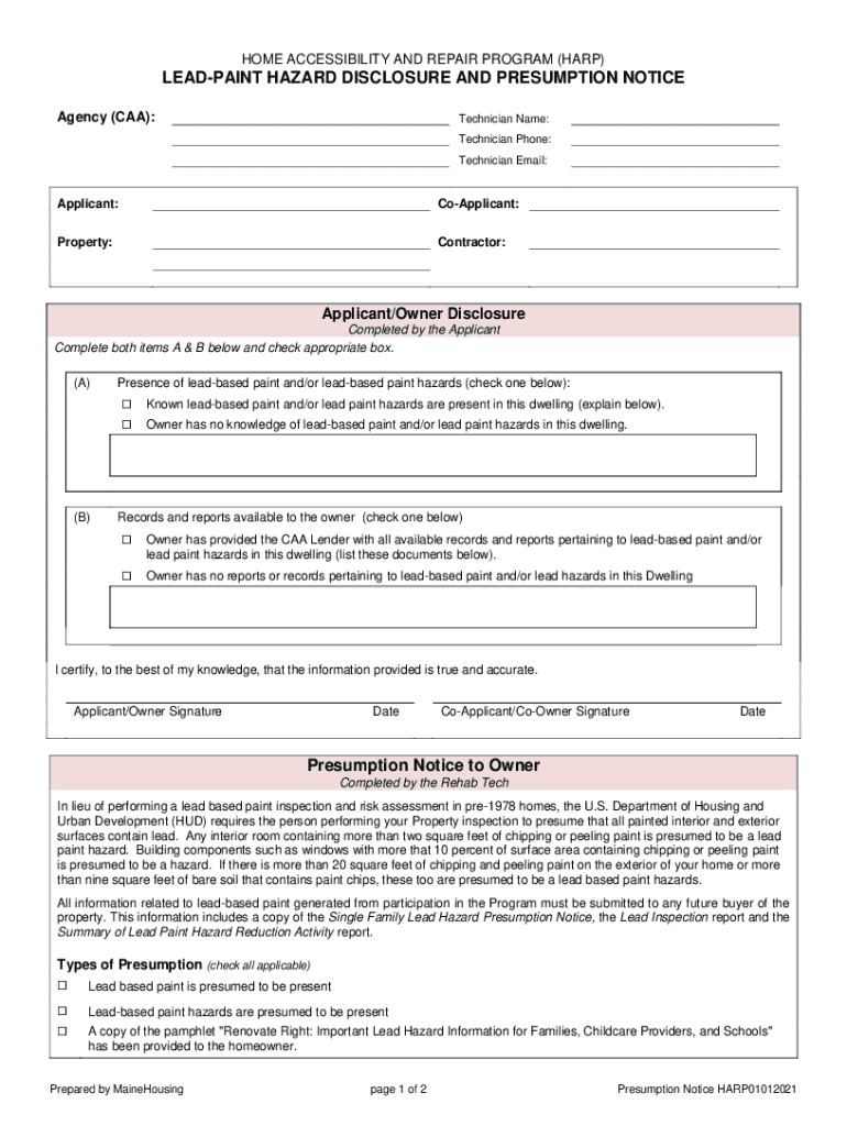HOME ACCESSIBILITY AND REPAIR PROGRAM (HARP)LEADING HAZARD DISCLOSURE AND PRESUMPTION NOTICE Agency (CAA):Technician Name: Technician Phone: Technician Email:Applicant:Applicant:Property:Contractor:Applicant/Owner