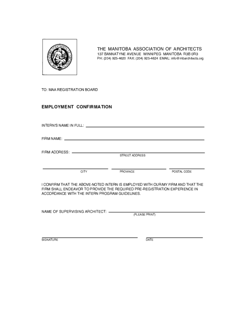 PH: (204) 9254620 FAX: (204) 9254624 EMAIL: info@mbarchitects.orgTO: MAY REGISTRATION BOARDEMPLOYMENT CONFIRMATIONINTERNS