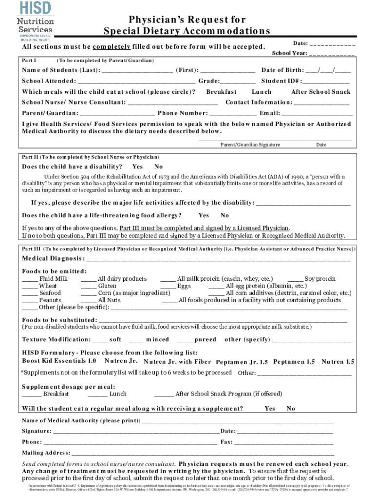 Physicians Request for Special Dietary Accommodations All sections must be completely filled out before form will be accepted. Part IDATE: School Year: (To be completed by Parent/Guardian)Name of