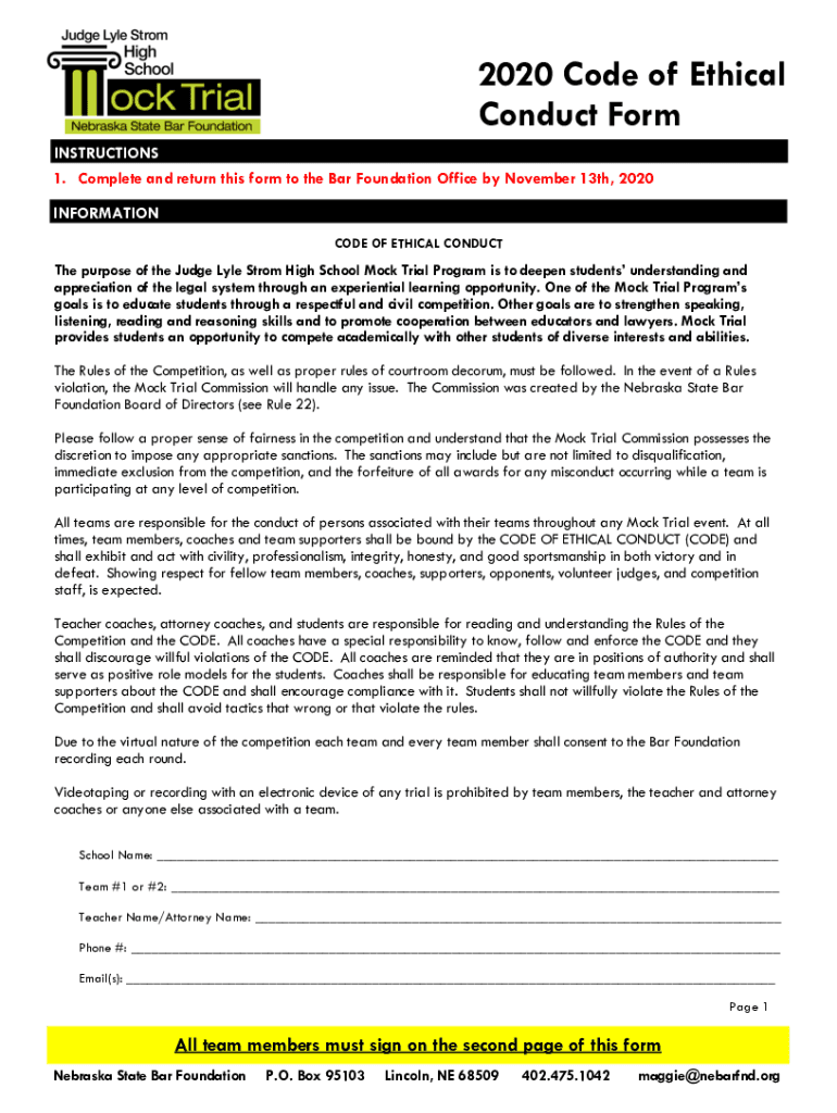 Get the free 2020 Code of Ethical Conduct Form - Nebraska State Bar ...