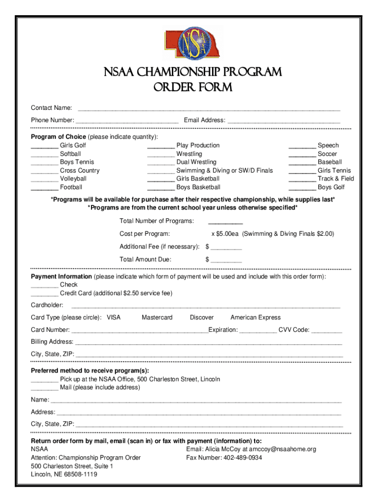 NCAA CHAMPIONSHIP PROGRAM ORDER FORM Contact Name: Phone Number: Email Address: Program of Choice (please indicate quantity): Girls Golf Play Production Softball Wrestling Boys Tennis Dual Wrestling