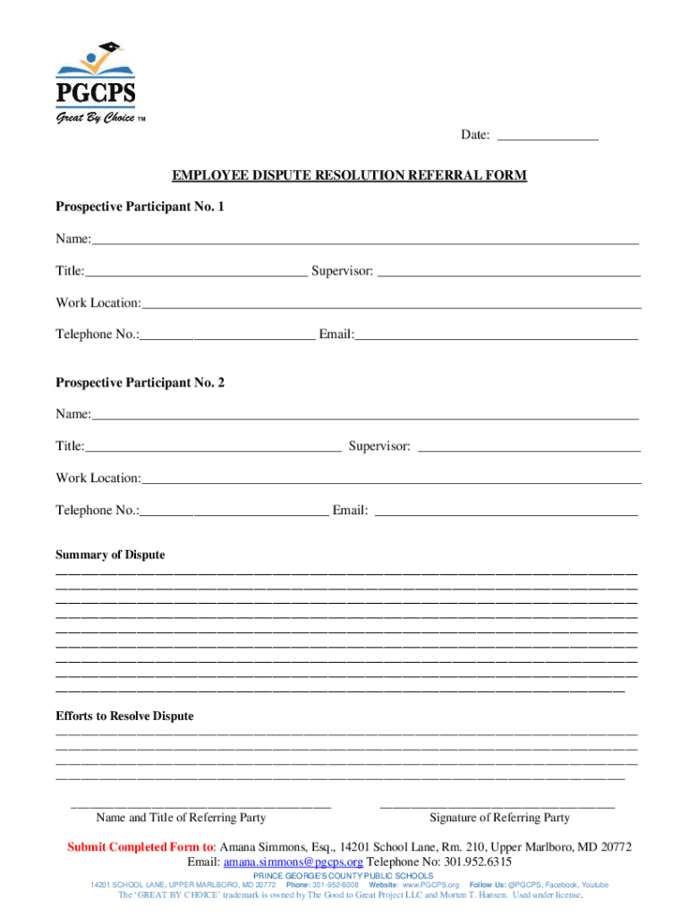 Date: EMPLOYEE DISPUTE RESOLUTION REFERRAL FORM Prospective Participant No. 1 Name: Title: Supervisor: Work Location: Telephone No.: Email: Prospective Participant No. 2 Name: Title: Supervisor: Work