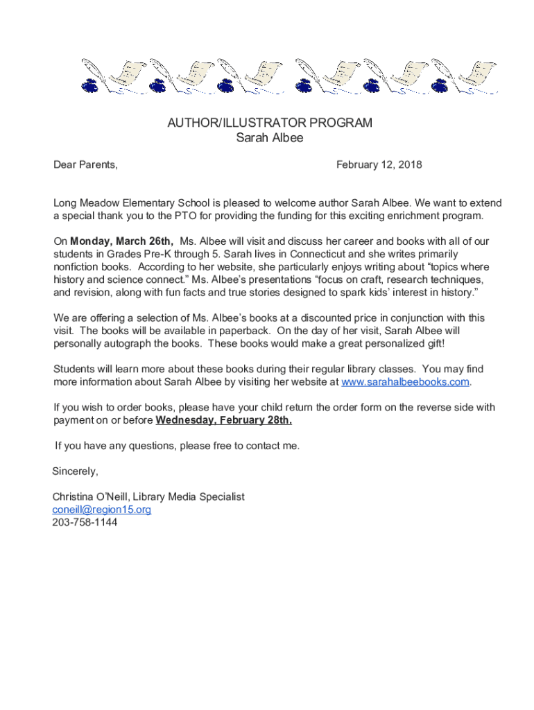 Dear Parents, February 12, 2018Long Meadow Elementary School is pleased to welcome author Sarah Albee. We want to extend