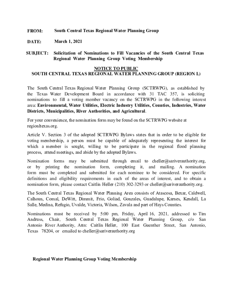 FROM:South Central Texas Regional Water Planning Groupware:March 1, 2021SUBJECT:Solicitation of Nominations to Fill Vacancies of the South Central Texas