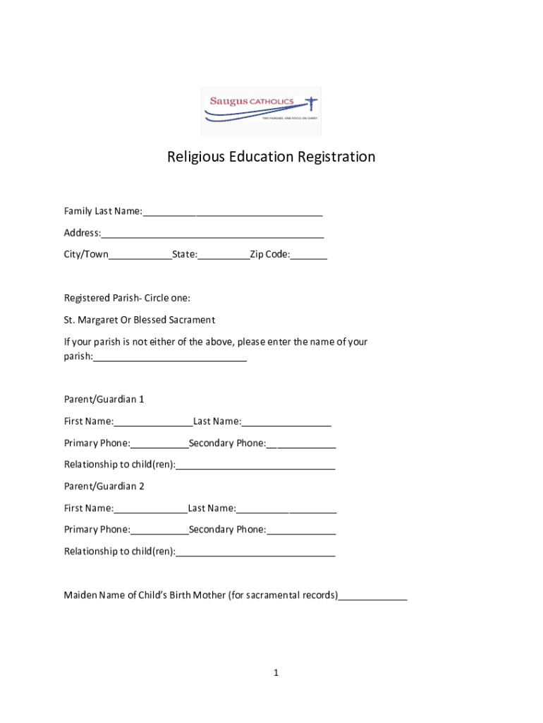 Religious Education Registration Family Last Name: Address: City/Town State: Zip Code: Registered Parish Circle one: St. Margaret Or Blessed Sacrament If your parish is not either of the above, please