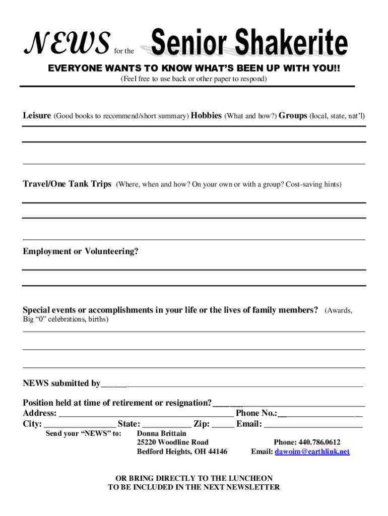 NEWS for everyone WANTS TO KNOW WHAT'S BEEN UP WITH YOU!! (Feel free to use back or other paper to respond)Leisure (Good books to recommend/short summary) Hobbies (What and how?) Groups (local, state,