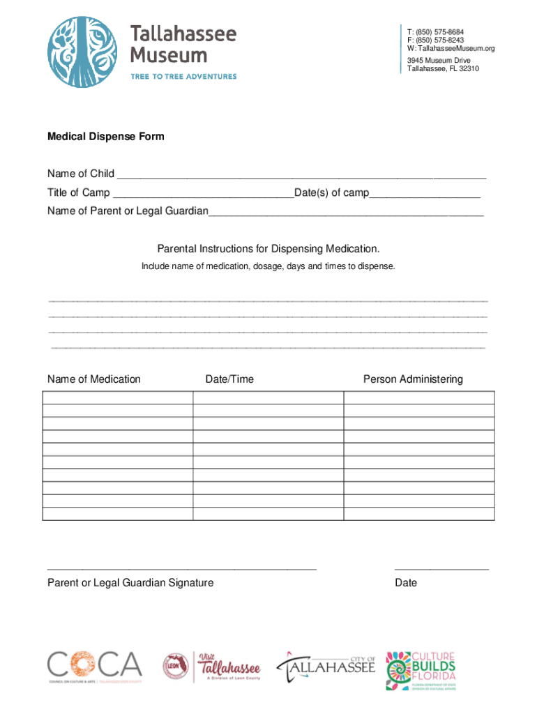 T: (850) 5758684 F: (850) 5758243 W: TallahasseeMuseum.org 3945 Museum Drive Tallahassee, FL 32310Medical Dispense Forename of Child Title of Camp Date(s) of camp Name of Parent or Legal Guardian