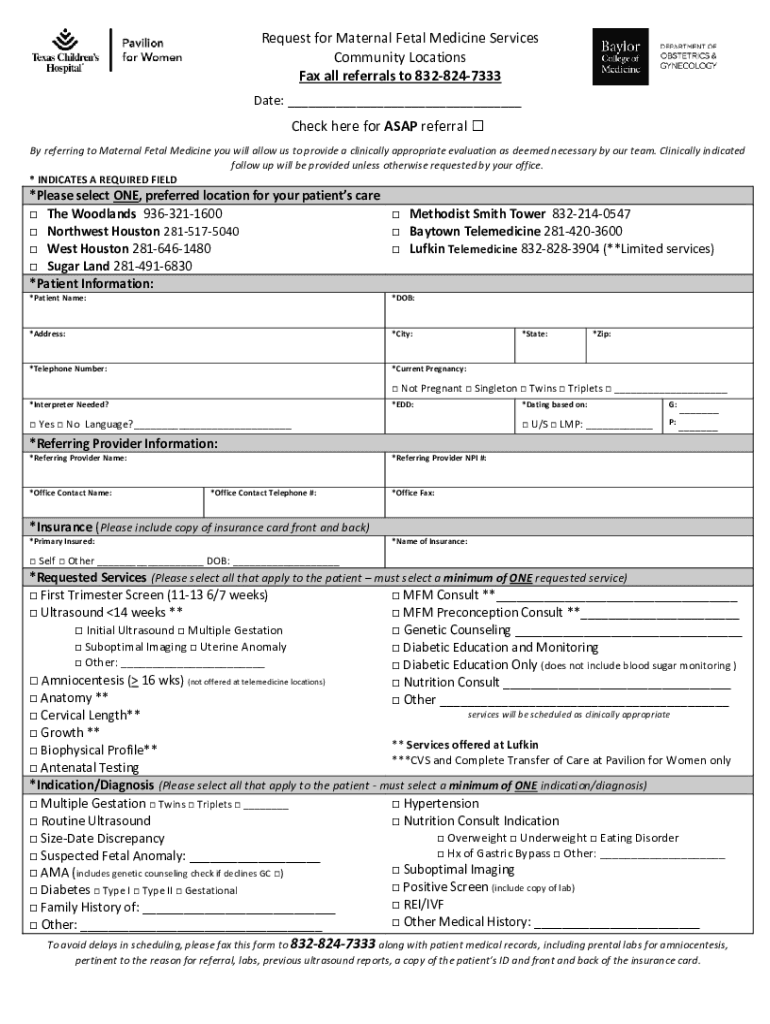 Request for Maternal Fetal Medicine Services Community Locations Fax all referrals to 8328247333 Date: Check here for ASAP referral By referring to Maternal Fetal Medicine you will allow us to provide