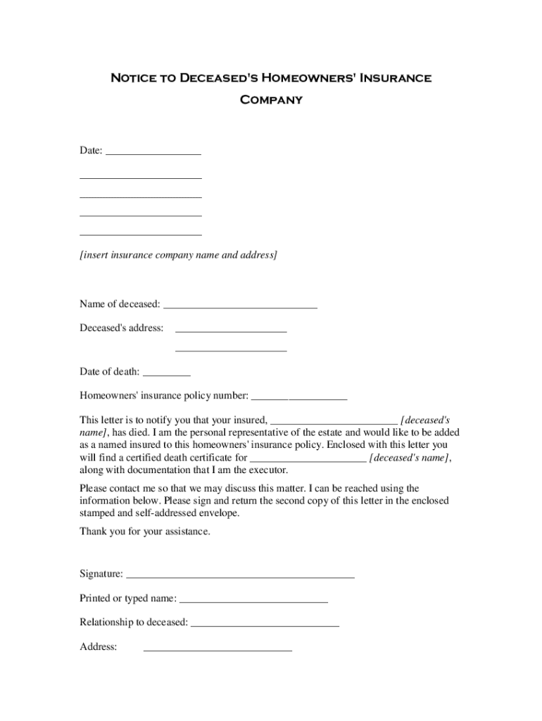 Notice to Deceased's Homeowners Insurance Compensate: insert insurance company name and address Name of deceased: Deceased's address: Date of death: Homeowners insurance policy number: This letter