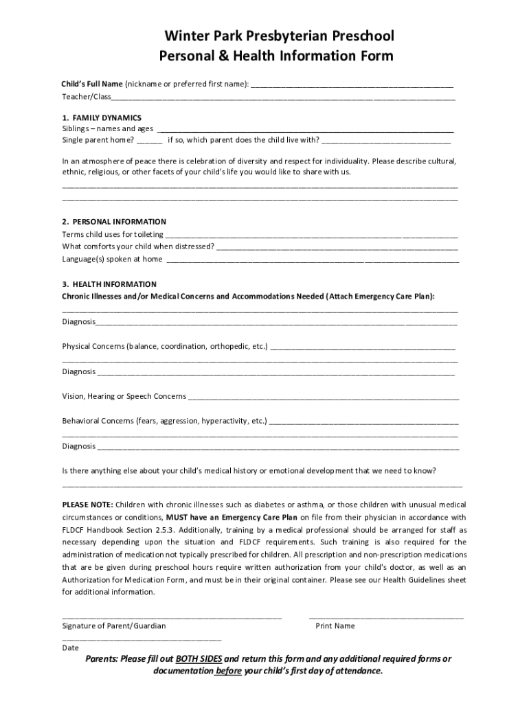 Winter Park Presbyterian Preschool Personal & Health Information Form Child's Full Name (nickname or preferred first name): Teacher/Class 1. FAMILY DYNAMICS Siblings names and ages Single parent home?