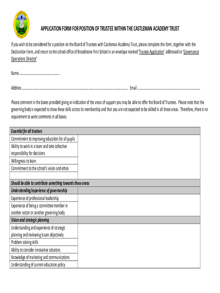 Get the free APPLICATION FORM FOR POSITION OF TRUSTEE WITHIN THE CASTLEMAN ...