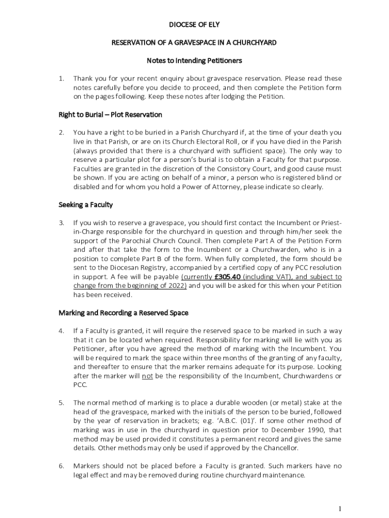 DIOCESE OF FLY RESERVATION OF A GRAVESTONE IN A CHURCHYARD Notes to Intending Petitioners 1. Thank you for your recent inquiry about grave space reservation. Please read these notes carefully before
