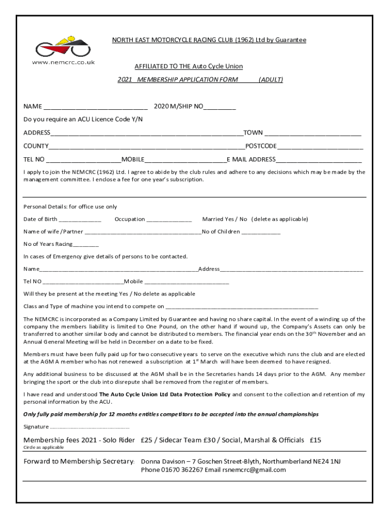 NORTH EAST MOTORCYCLE RACING CLUB (1962) Ltd by GuaranteeAFFILIATED TO THE Auto Cycle Union 2021 MEMBERSHIP APPLICATION FORM(ADULT)NAME 2020 M/SHIP NO Do you require an ACU License Code Y/N ADDRESS