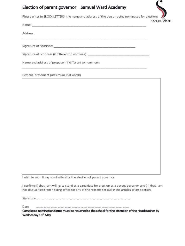 Election of parent governor Samuel Ward Academy Please enter in BLOCK LETTERS, the name and address of the person being nominated for election: Name: Address: Signature of nominee: Signature of proposer