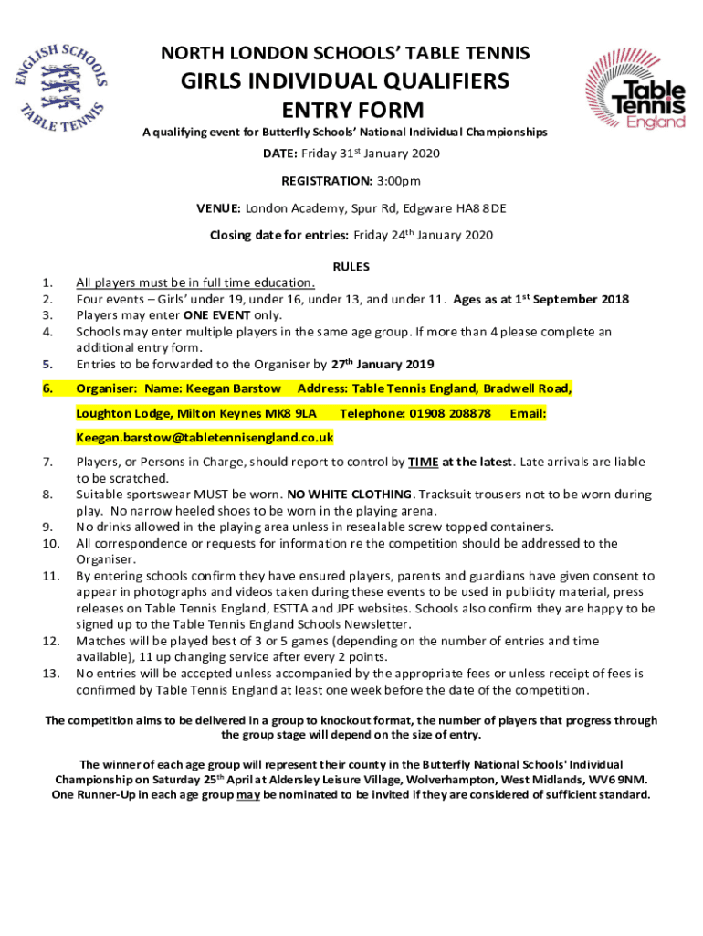 NORTH LONDON SCHOOLS TABLE TENNISGIRLS INDIVIDUAL QUALIFIERS ENTRY FORM A qualifying event for Butterfly Schools National Individual ChampionshipsDATE: Friday 31st January 2020 REGISTRATION: 3:00pm