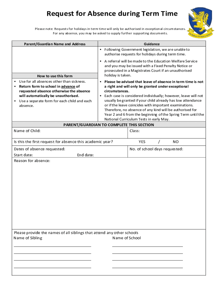Request for Absence during Term Time Please note: Requests for holidays in term time will only be authorized in exceptional circumstances. For any absence, you may be asked to supply further supporting