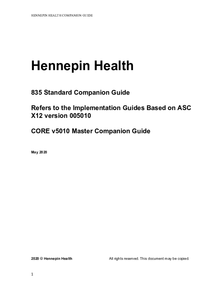 HENNEPIN HEALTH COMPANION GUIDEHennepin Health 835 Standard Companion Guide Refers to the Implementation Guides Based on ASC X12 version 005010 CORE v5010 Master Companion Guide May 20202020 Hennepin