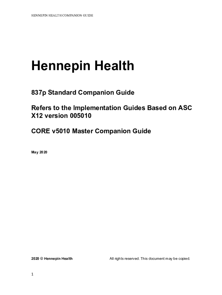 HENNEPIN HEALTH COMPANION GUIDEHennepin Health 837p Standard Companion Guide Refers to the Implementation Guides Based on ASC X12 version 005010 CORE v5010 Master Companion Guide May 20202020 Hennepin