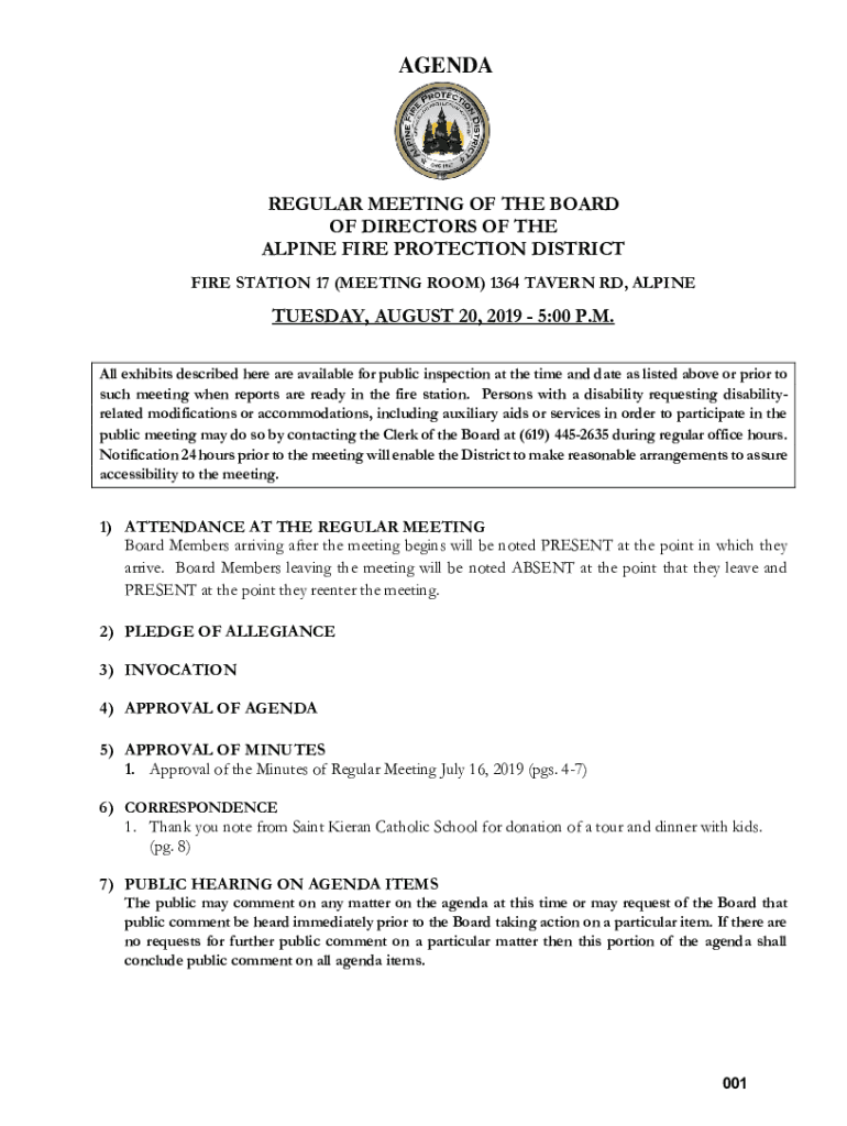 AGENDAREGULAR MEETING OF THE BOARD OF DIRECTORS OF THE ALPINE FIRE PROTECTION DISTRICT FIRE STATION 17 (MEETING ROOM) 1364 TAVERN RD, ALPINETUESDAY, AUGUST 20, 2019 5:00 P.M. All exhibits described
