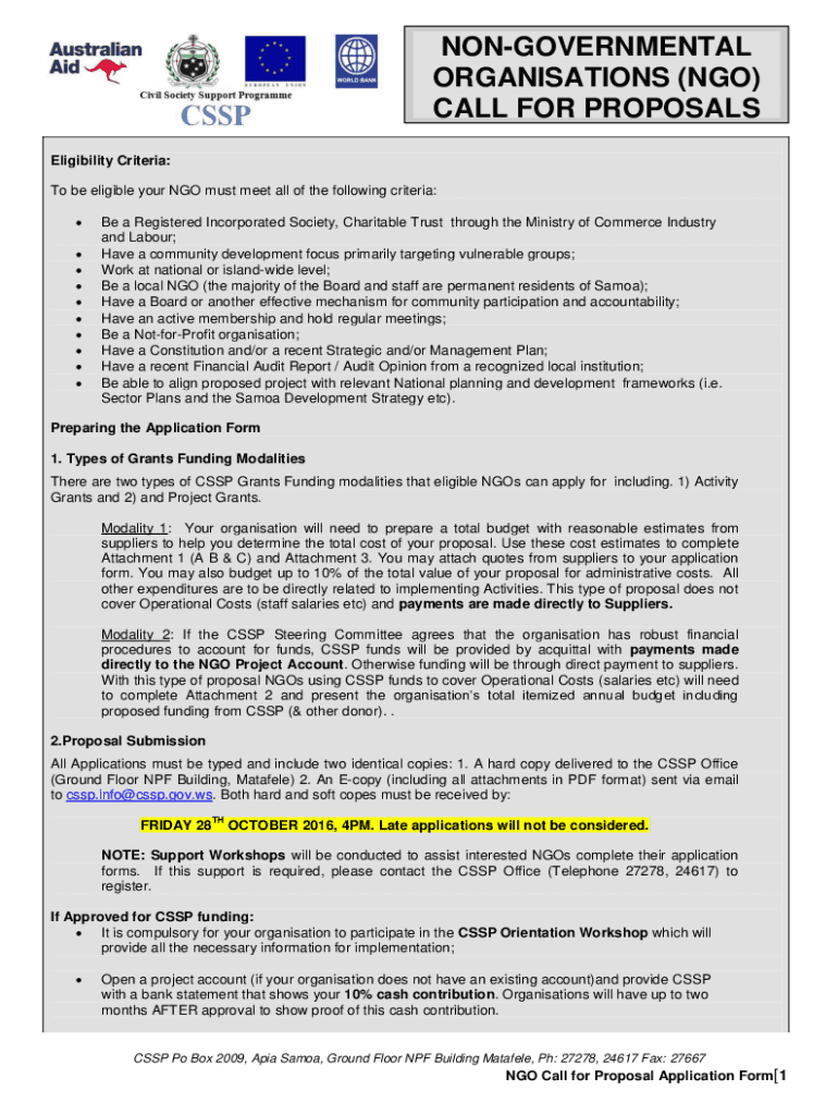 NONGOVERNMENTAL Organizations (NGO) CALL FOR PROPOSALS Eligibility Criteria: To be eligible your NGO must meet all the following criteria: Be a Registered Incorporated Society, Charitable Trust through