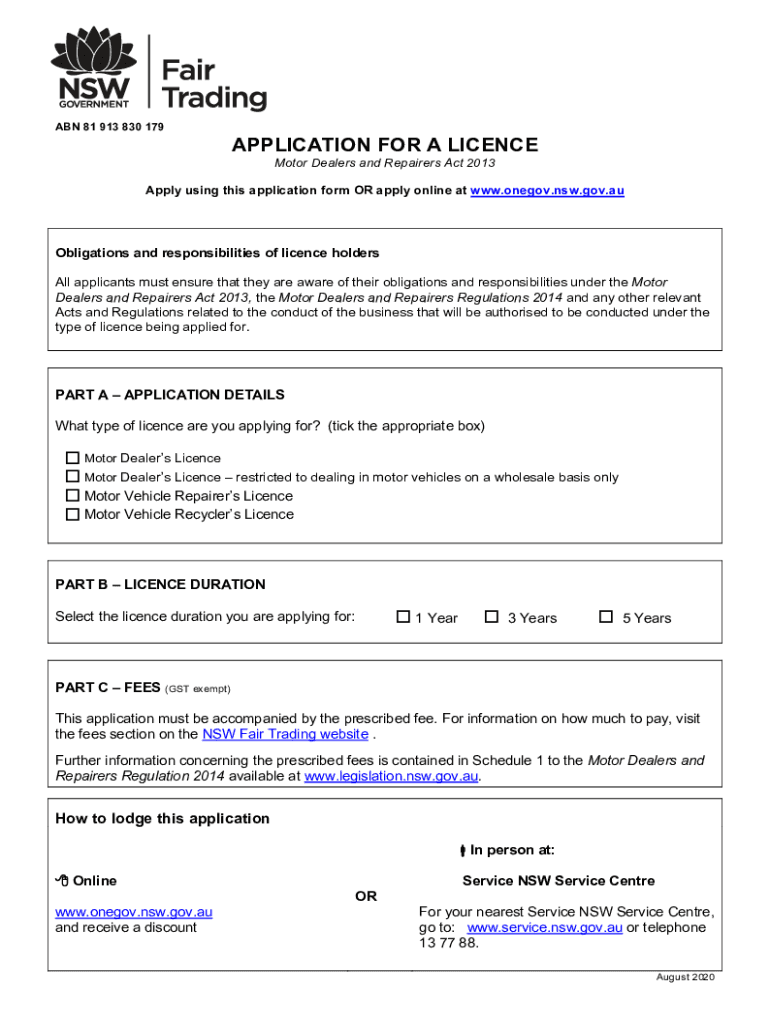 Motor Dealers and Repairers Act 2013Apply using this application form OR apply online at www.onegov.nsw.gov.auObligations and responsibilities of license