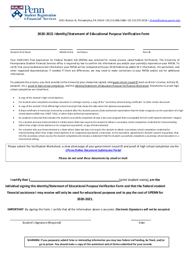 3451WalnutSt,Philadelphia,PA19104(P)215.898.1988(F)215.573.5428sfsmail poor.Penn.edu 20202021Identity/StatementofEducationalPurposeVerificationForm StudentsFirstNameMiddleInitial LastNamePennID Your