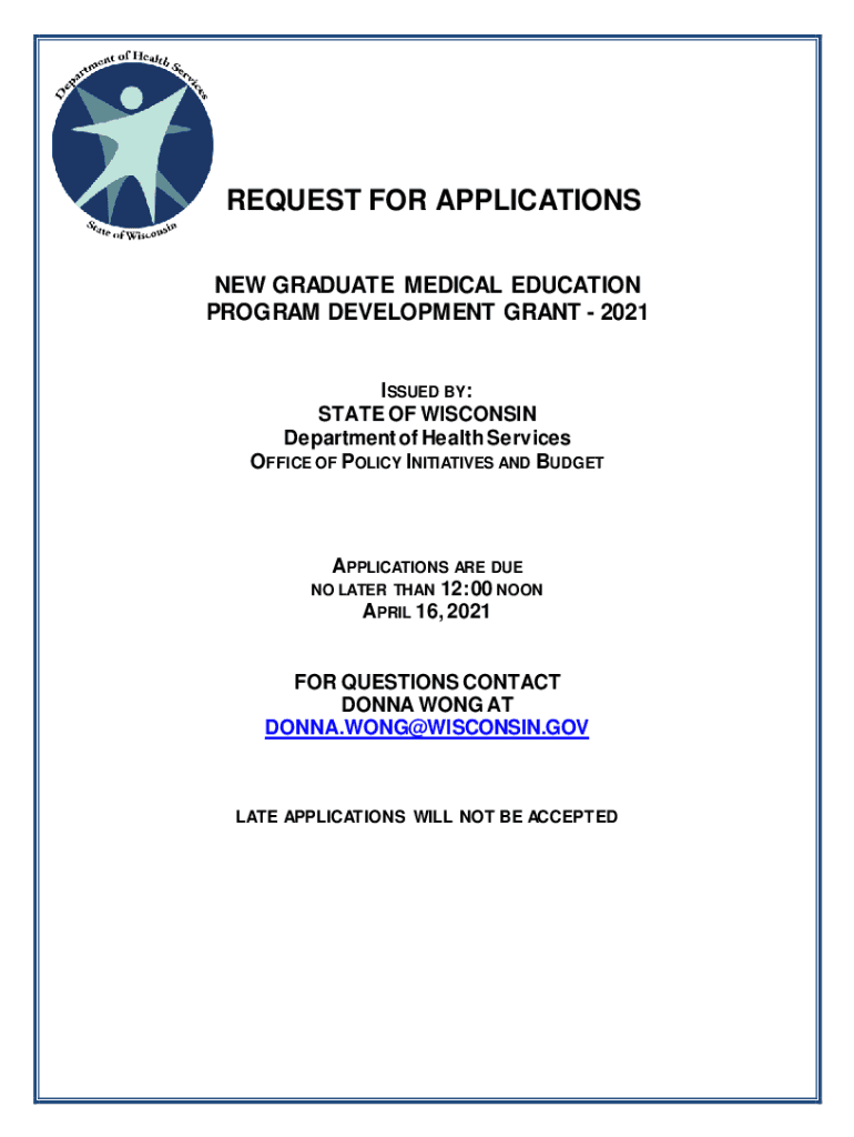 REQUEST FOR APPLICATIONS NEW GRADUATE MEDICAL EDUCATION PROGRAM DEVELOPMENT GRANT 2021ISSUED BY : STATE OF WISCONSIN Department of Health Services OFFICE OF POLICY INITIATIVES AND BUDGETAPPLICATIONS