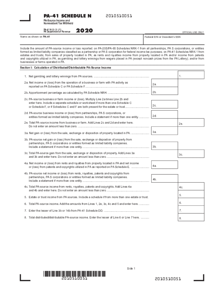 Get the free 2020 PA-41 Schedule N - PA-Source Income and Nonresident Tax Withheld (PA-41 N). For...