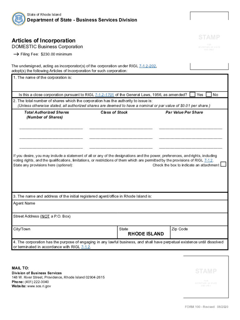 State of Rhode IslandDepartment of State Business Services Division Instructions for Filing Articles of Incorporation for a Domestic Business Corporation Section 71.2202 of the General Laws of Rhode