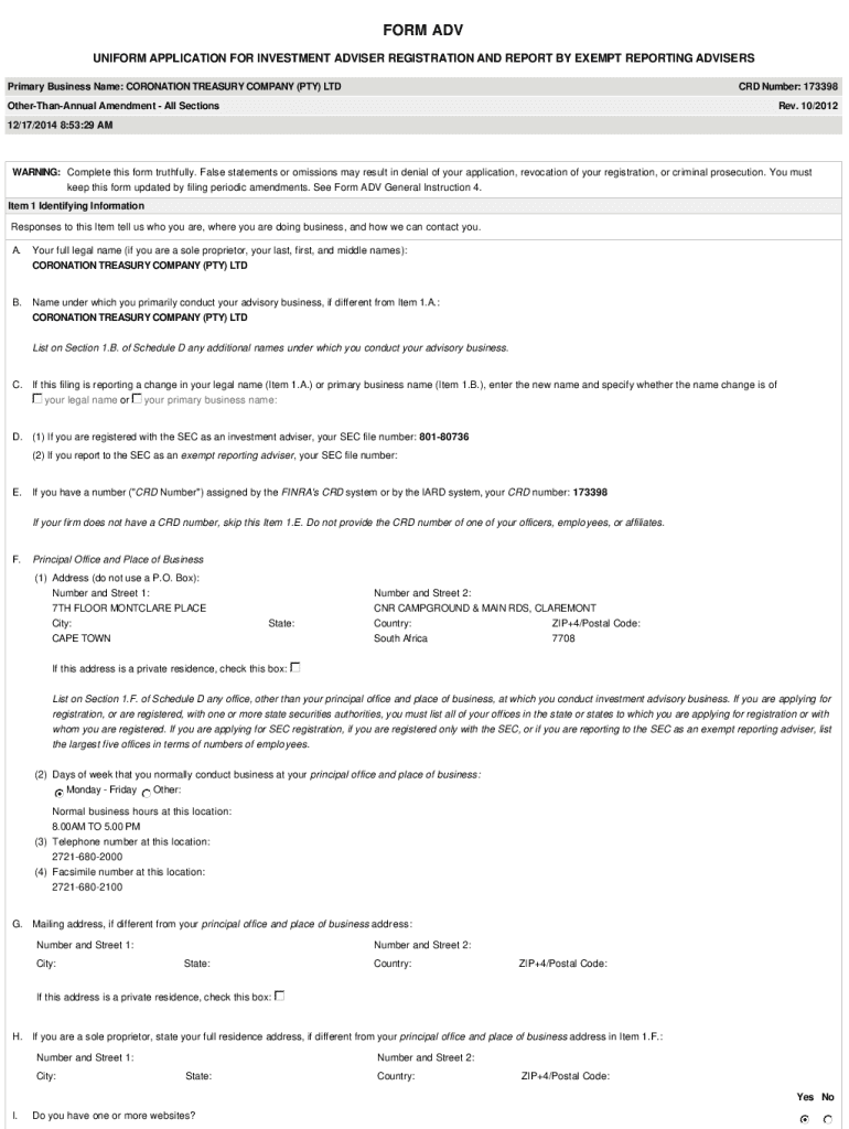 FORM ADV UNIFORM APPLICATION FOR INVESTMENT ADVISER REGISTRATION AND REPORT BY EXEMPT REPORTING ADVISERS Primary Business Name: CORONATION TREASURY COMPANY (PTY) LTD CRD Number: 173398OtherThanAnnual