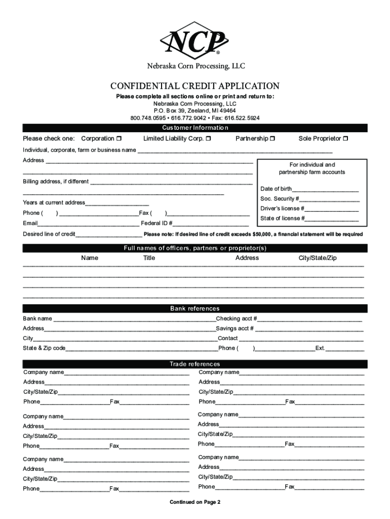 NCP Nebraska Corn Processing, CONFIDENTIAL CREDIT APPLICATION Please complete all sections online or print and return to: Nebraska Corn Processing, LLC P.O. Box 39, Zeeland, MI 49464 800.748.0595