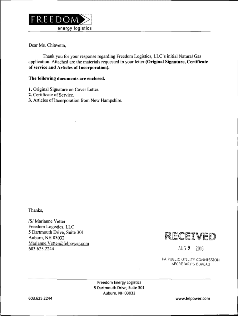Thank you for your response regarding Freedom Logistics, LCS initial Natural Gas