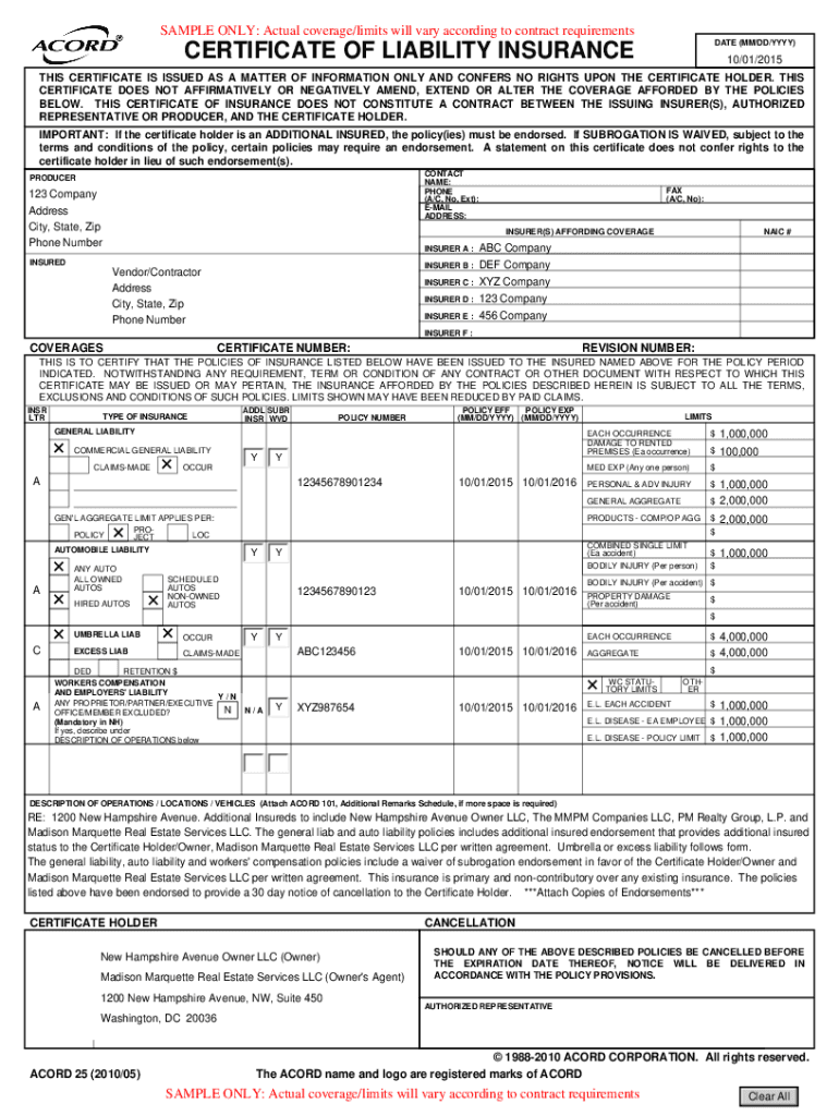 SAMPLE ONLY: Actual coverage/limits will vary according to contract requirements DATE (MM/DD/YYY)CERTIFICATE OF LIABILITY INSURANCE10/01/2015THIS CERTIFICATE IS ISSUED AS A MATTER OF INFORMATION ONLY