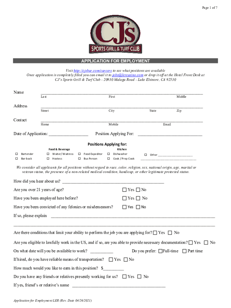 Page 1 of 7APPLICATION FOR EMPLOYMENT Visit http://cjsbar.com/careers to see what positions are available Once application is completely filled you can email it to jobs lercasino.com or drop it off