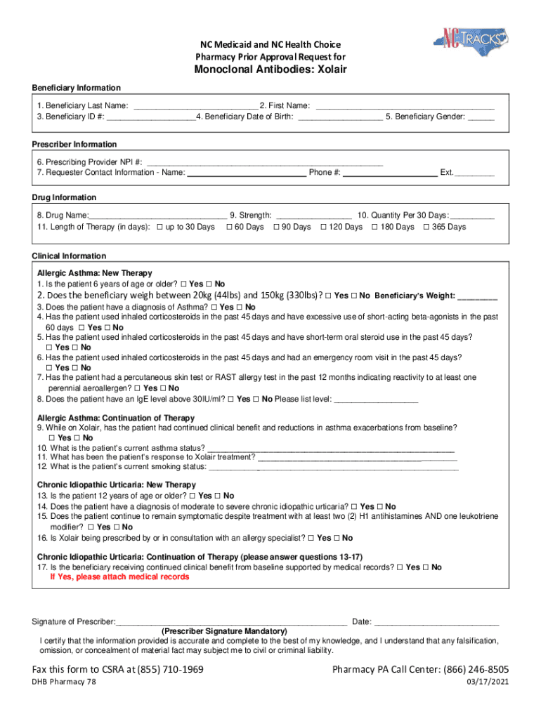 NC Medicaid and NC Health Choice Pharmacy Prior Approval Request monoclonal Antibodies: Beneficiary Information 1. Beneficiary Last Name: 2. First Name: 3. Beneficiary ID #: 4. Beneficiary Date of