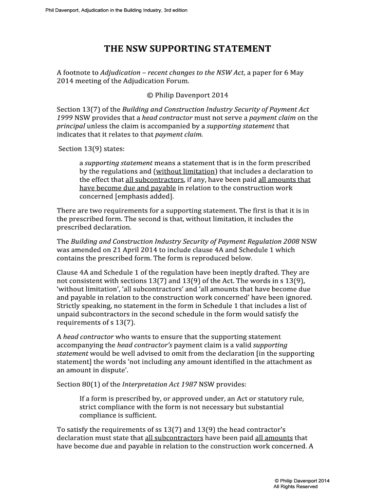Certain conditions necessitate the use of the NSW Supporting Statement Form. Typically, it is required when filing payment claims as a means to ensure compliance with legal and contractual obligations. Specifically, disputes that may arise during the payment process can influence the form's completion, emphasizing its importance in maintaining order and clarity in payment practices.
