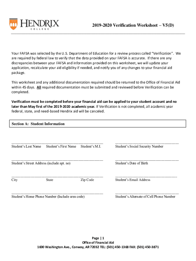 20192020 Verification Worksheet V5(D)Your FAFSA was selected by the U.S. Department of Education for a review process called Verification. We are required by federal law to verify that the data provided