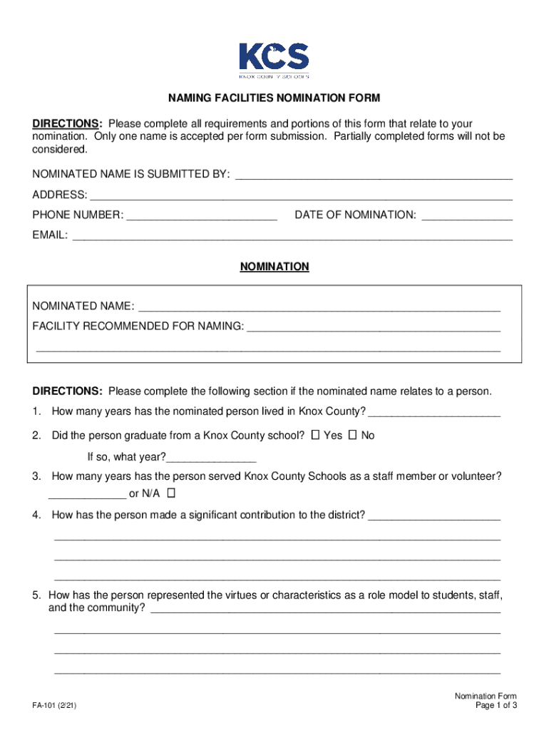 The naming facilities nomination formtemple requires the proposed name, reason for the nomination, and contact information.