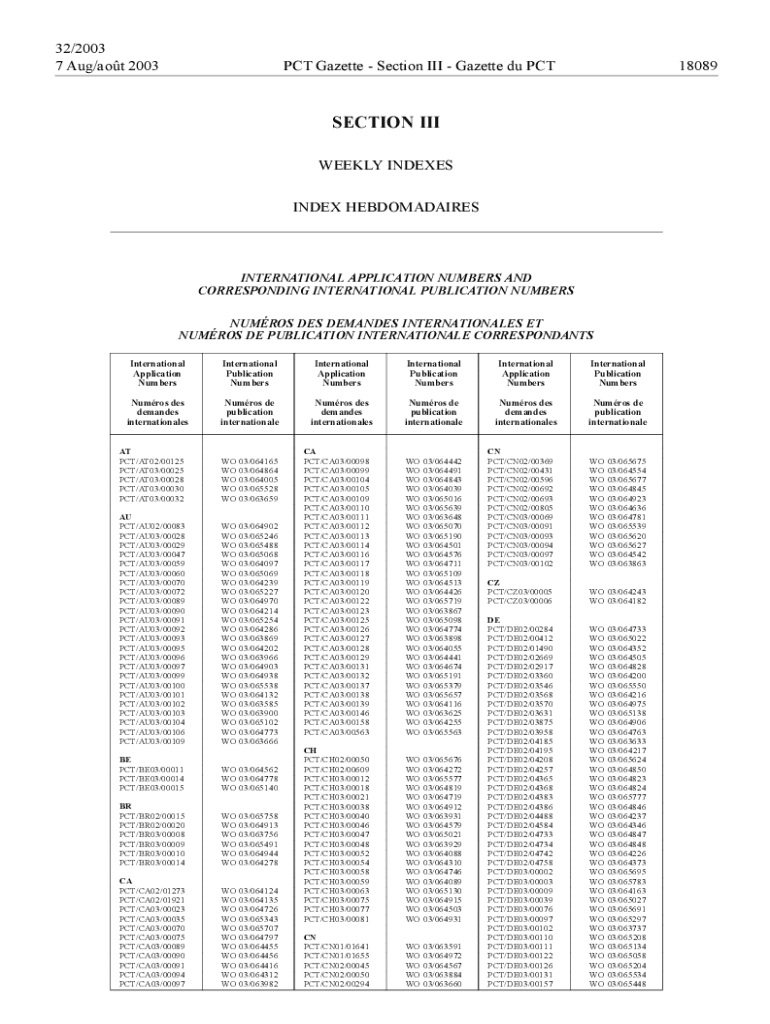 32/2003 7 Aug/AOT 2003PCT Gazette Section III Gazette du PCT18089SECTION III WEEKLY INDEXES INDEX HEBDOMADAIRESINTERNATIONAL APPLICATION NUMBERS AND CORRESPONDING INTERNATIONAL PUBLICATION NUMBERS