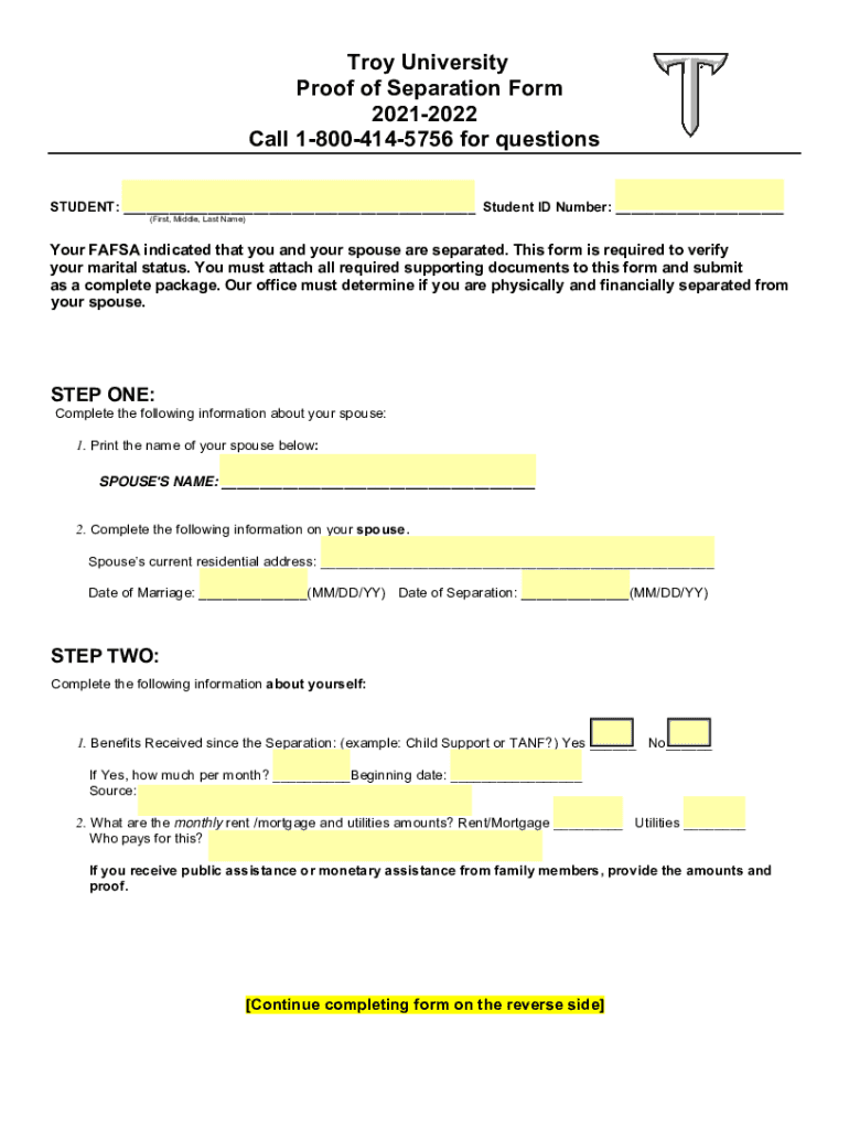 Reset Form Save AsPrintTroy University Proof of Separation Form 20212022 Call 18004145756 for questions STUDENT: Student ID Number: (First, Middle, Last Name)Your FAFSA indicated that you and your