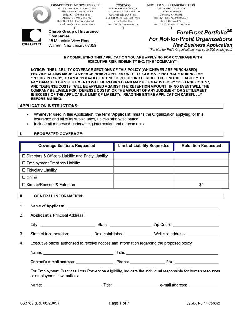 The Chubb ForeFront Portfolio New Business Application is a service agreement used by not-for-profit organizations to apply for insurance coverage with Executive Risk Indemnity Inc.