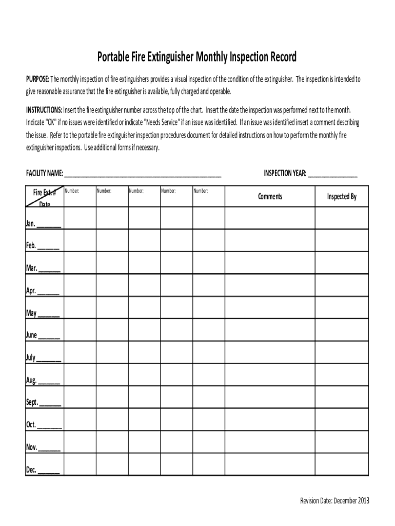 Portable Fire Extinguisher Monthly Inspection Record PURPOSE: The monthly inspection of fire extinguishers provides a visual inspection of the condition of the extinguisher. The inspection is intended