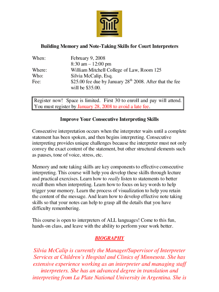 Building Memory and Note-taking Skills for Court Interpreters When: Where: Who: Fee:February 9, 2008 8:30 am 12:00 pm William Mitchell College of Law, Room 125 Silvia McCain, Esq. $25.00 fee due by