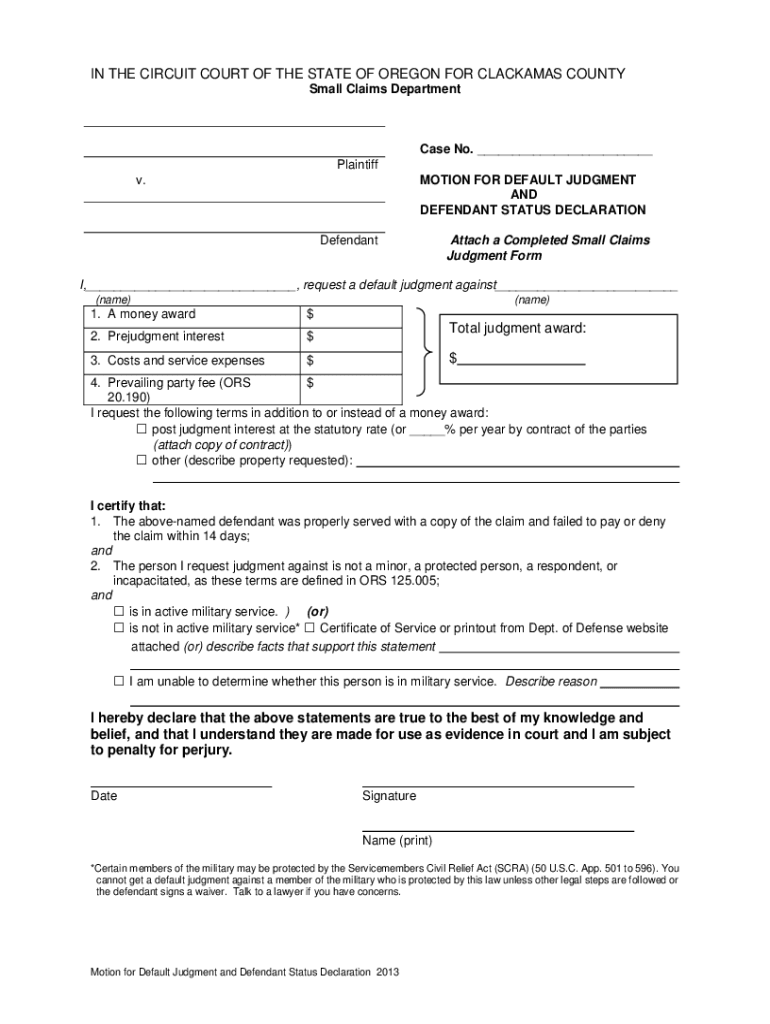IN THE CIRCUIT COURT OF THE STATE OF OREGON FOR CLACKAMAS COUNTY Small Claims Department Case No. Plaintiff MOTION FOR DEFAULT JUDGMENT AND DEFENDANT STATUS Declaration. DefendantAttach a Completed