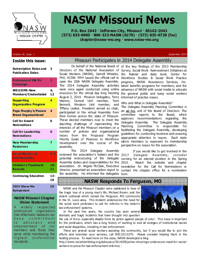 NASA Missouri News P.O. Box 2043 Jefferson City, Missouri 651022043 (573) 6356965 800333NASW (6279) (573) 6356728 (fax) chapter name.org www.naswmo.orgVolume 41, Issue 1September 2014Missouri Participates